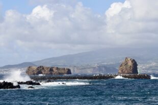 Klettaeyjar utan við höfnina í Pico; mér skilst að þær kallist Liggjandi og Standandi. Nágrannaeyjan Faial í baksýn.