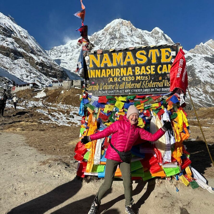 ,,Í fyrra sinnið sem ég gekk í Nepal gekk ég upp að grunnbúðum Everest eða að Kala Patthar sem er í 5550 metra hæð en um daginn  gengum við að grunnbúðum Annapurna sem er í 4200 metra hæð og er enn fallegri leið finnst mér en það eru mörg þúsund tröppur á leiðinni,“ segir Margrét.